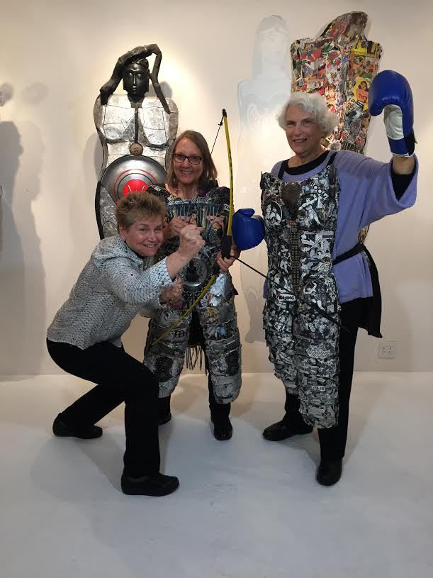 L. to r., artist Linda Stein, Sonja Hedgepeth and Rochelle Saidel in the artist's studio with her wearable sculpture protectors. Stein's tapestries of heroes of the Holocaust and World War II were exhibited at the conference.