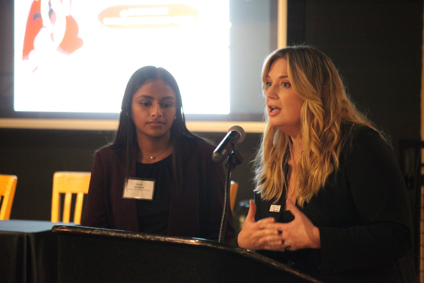 Sarah Samdani, left, president of the Rutgers Student Chapter, and Jennifer Mancuso, president of Women’s Political Caucus of New Jersey, offer welcome remarks.