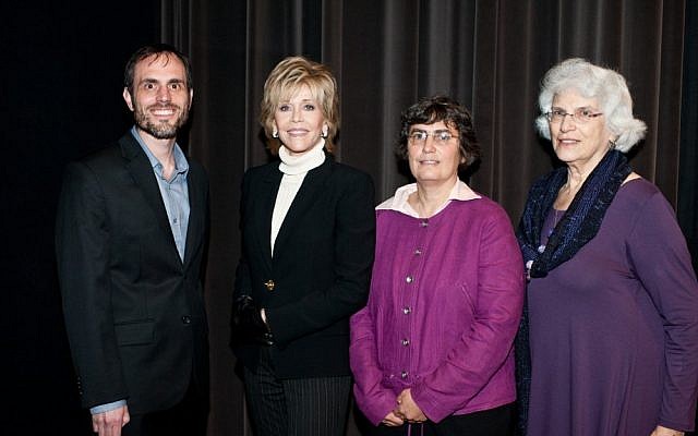 Jane Fonda (second from left) appears with scholars Dan Leshem, Jessica Neuwirth (second from right) and Rochelle G. Saidel at a Los Angeles symposium on sexual violence during the Holocaust. (Photo credit: Courtesy of Kim Fox)