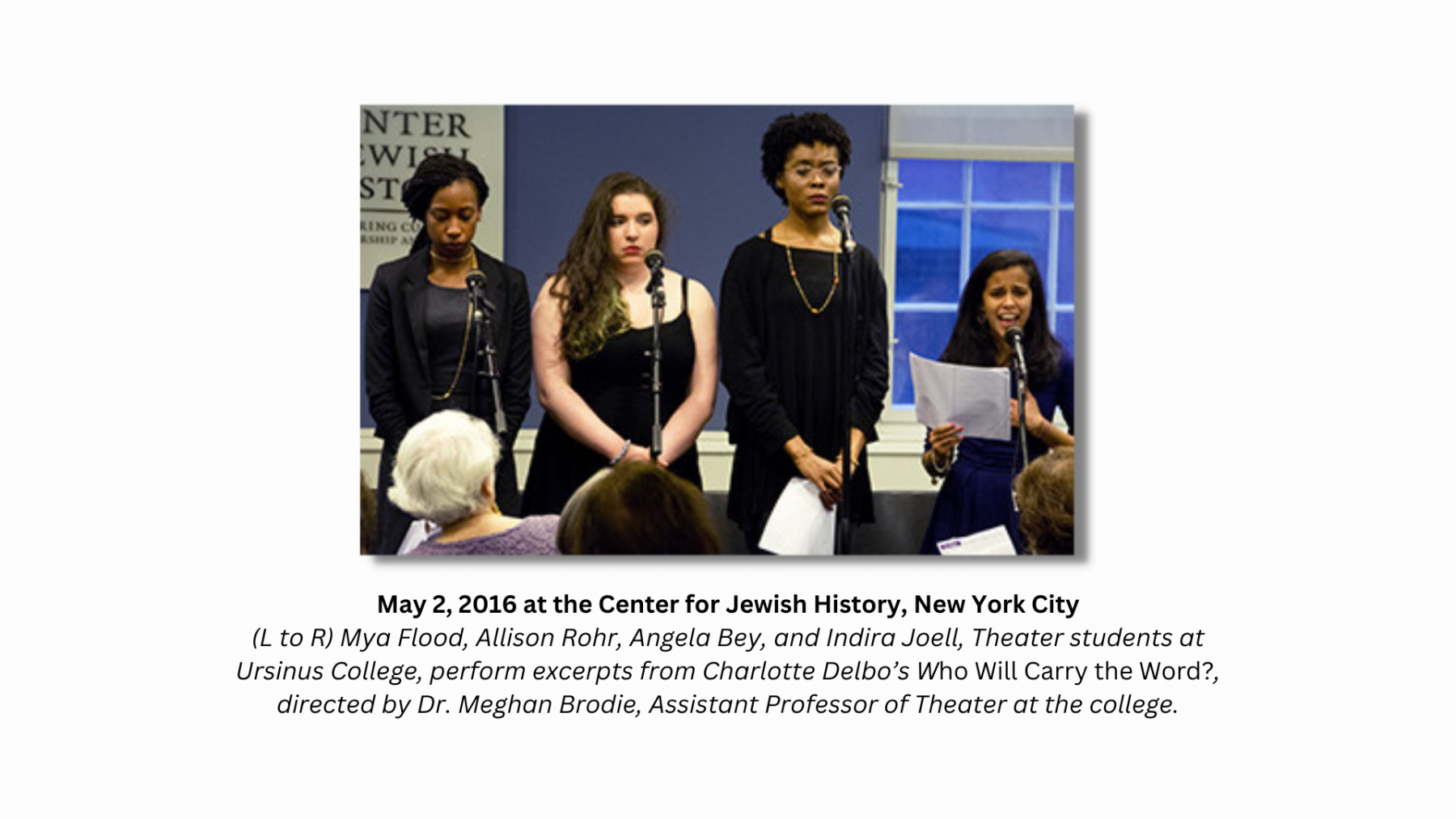 The free online handbook is available from this website. It has a detailed introduction, annotated bibliographies of plays about women during the Holocaust; of plays about the Holocaust written by women; and relevant books. There is also a framework for teaching, as well as personal essays about aspects of creating and staging theatrical works about women and the Holocaust. For our forthcoming fifth edition, in alphabetical order, the essays are by are Dr. Meghan Brodie, Cynthia L. Cooper, Dr. Patrick Henry, Dr. Velina Hasu Houston, Susan B. Katz, Naomi Patz, Dr. Alice Shalvi, and myself. Dr. Brodie, a professor in the Department of Theater and Dance at Ursinus College, and playwright Cynthia L. Cooper have been working with us since the inception on our annual readings events.